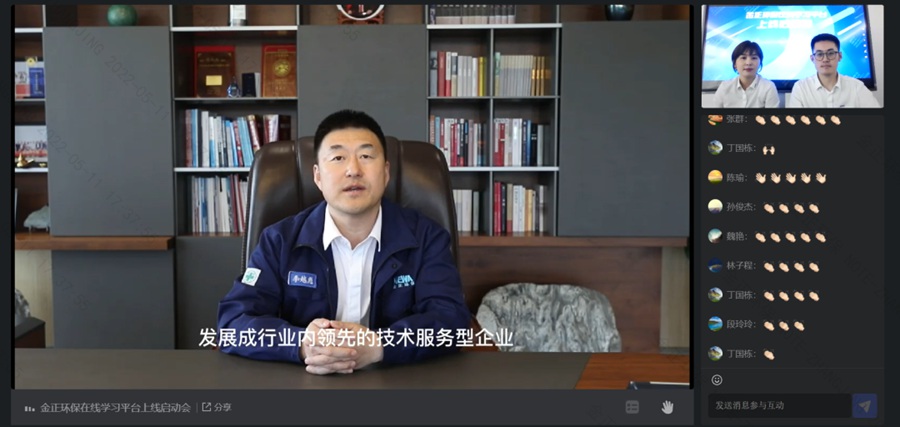 為持續做好疫情防控工作,避免人員聚集,“金正環保在線學習平臺”啟動會以線上直播形式進行,煙臺金正環保總經理李越彪線上致辭。