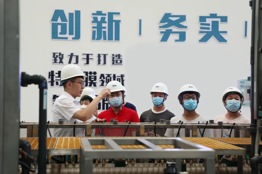 青少年志愿者們依次走訪了公司大數據中心、展廳、膜中心、組裝車間、研發實驗室等地。在這里,志愿者們近距離了解,世界領先的污廢水資源化和高品質再生水回用工藝技術,實現年減排污廢水7300萬噸;聆聽“中國人用自己的工藝包”解決“卡脖子”的發展難題”,打破國外技術壟斷的項目故事;感知世界領先的“特種膜全自動化生產線”,如何集聚工業互聯網、工業機器人、5G等先進技術,開啟世界膜工業智能制造時代。